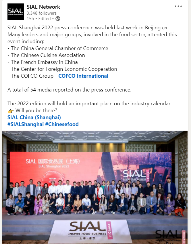 SIAL 2022 国际食品展(上海)在SIAL全球食品展官方LinkedIn账号上获得了法国、巴西、罗马尼亚、阿根廷、阿联酋、土耳其等国家食品品牌、贸易代表、合作伙伴的点赞