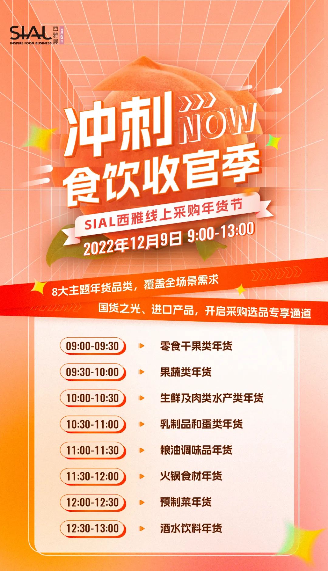 本次私域供需对接,将继续以“SIAL西雅线上采购年货节”8大年货品类为依托,包括:零食干果类年货、果蔬类年货、生鲜及肉类水产年货、乳制品和蛋类年货、粮油调味品年货、火锅食材年货、预制菜年货、酒水饮料年货等,通过SIAL西雅展私域社群,为食饮行业供应商和采购商提供商贸对接机会。